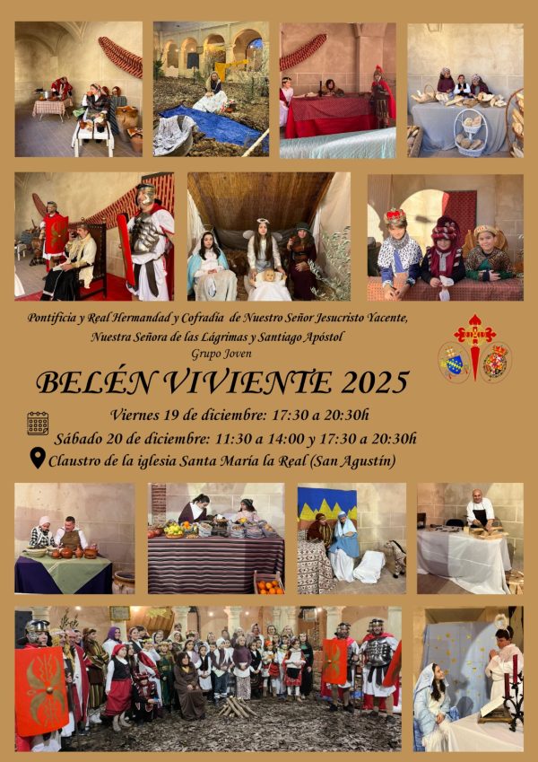 19 y 20 de diciembre, Belén Viviente de la Cofradía del Santo Entierro en el claustro situado a la izquierda de la puerta principal de la iglesia de Santa María la Real (San Agustín). En dicho espacio se dará vida a distintas escenas en torno al Nacimiento de Cristo (la Anunciación, la huida a Egipto, el Belén, el castillo de Herodes…), Podrá visitarse el viernes 19 y el sábado 20 de diciembre, en horario de 17:30 a 20:30 horas, el sábado también en horario de mañana, de 11:30 a 14:00 horas.